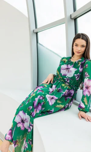 Rochie lungă de ocazie cu floare în talie și decolteu petrecut