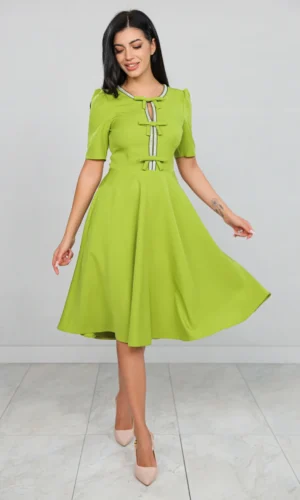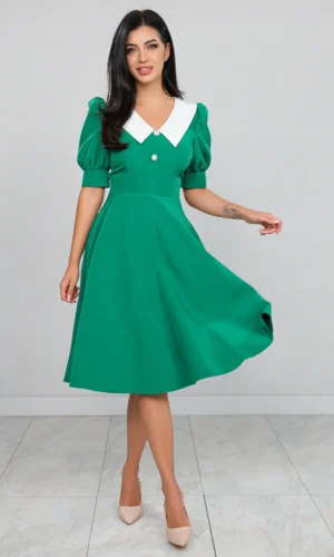 Rochie Verde cu Guler Stilizat și Mânecă Bufantă
