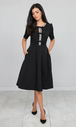 Rochie Neagră cu Mânecă Scurtă și Bandă Stilizată