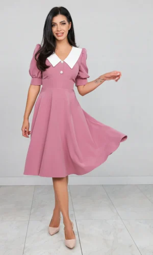Rochie Roz cu Guler Stilizat si Mânecă Bufantă