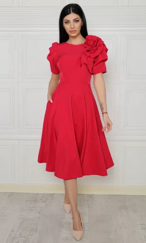 Rochie elegantă midi visinie cu floare decorativă
