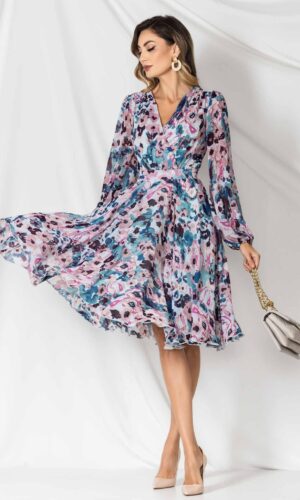 Rochie în cloș din voal multicolor cu mânecă lungă