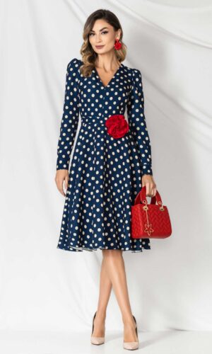 Rochie cu buline în cloș cu decolteu în V și broșă detașabilă
