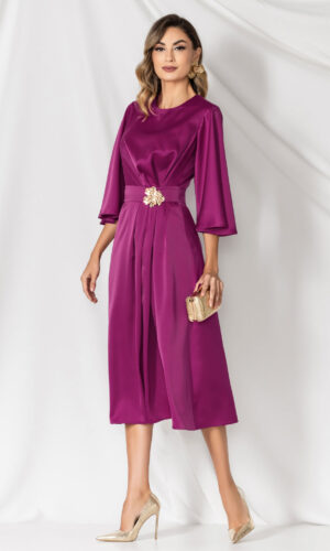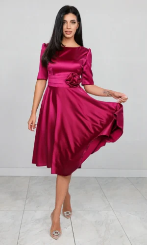 Rochie magenta satinata cu floare 3D in talie