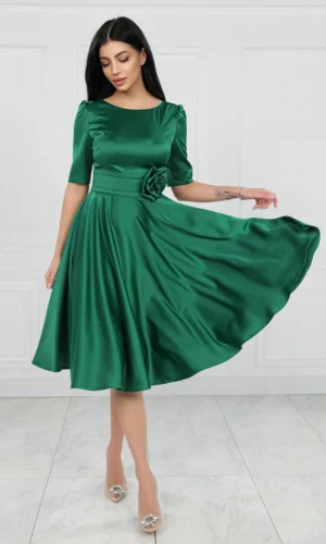 Rochie verde satinata cu floare 3D in talie