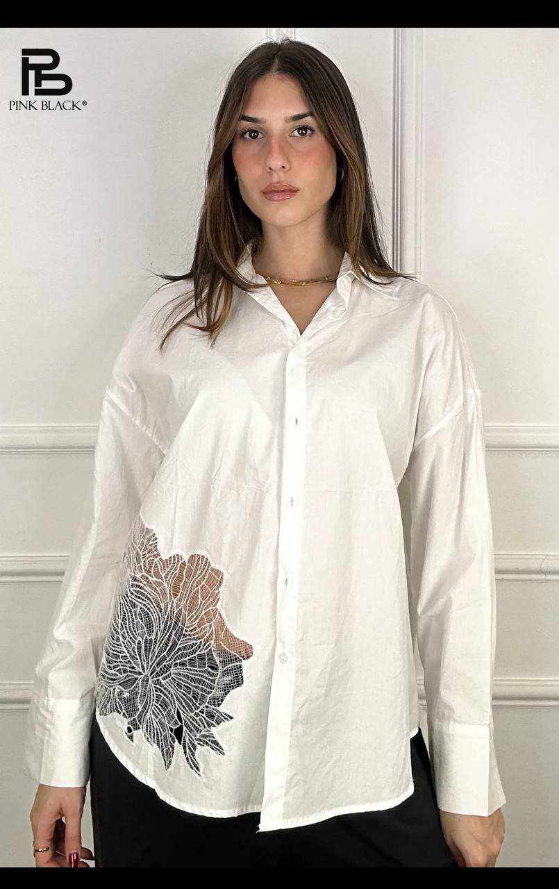 Broderia delicată pe cămașă conferă un aer feminin și sofisticat, perfect pentru a crea ținute stilate atât pentru birou, cât și pentru ocazii speciale.