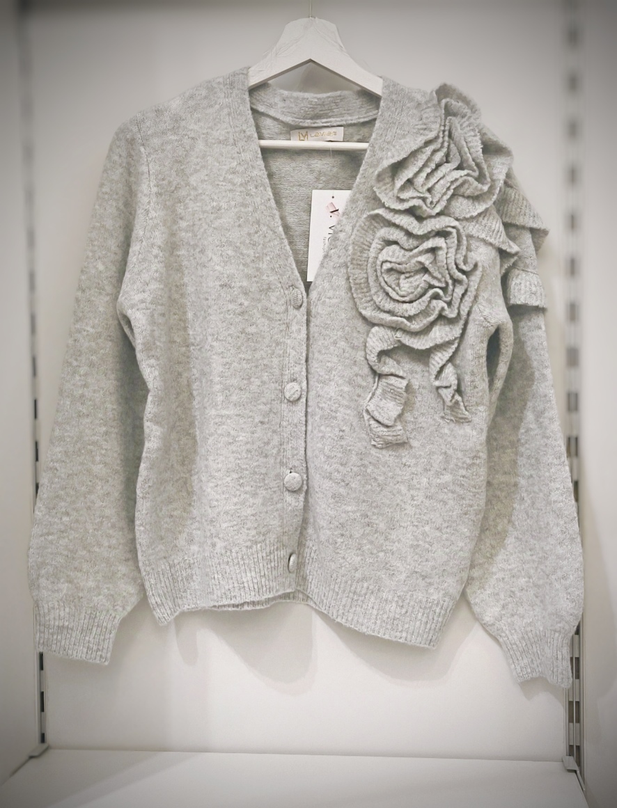 Adaugă un strop de rafinament garderobei tale cu acest pulover cu nasturi, accesorizat cu o floare delicată pe umăr.