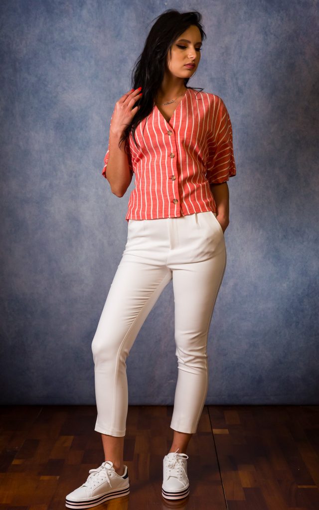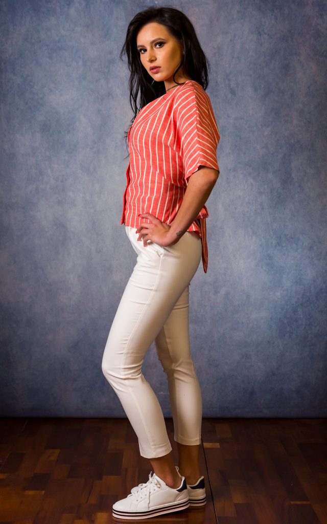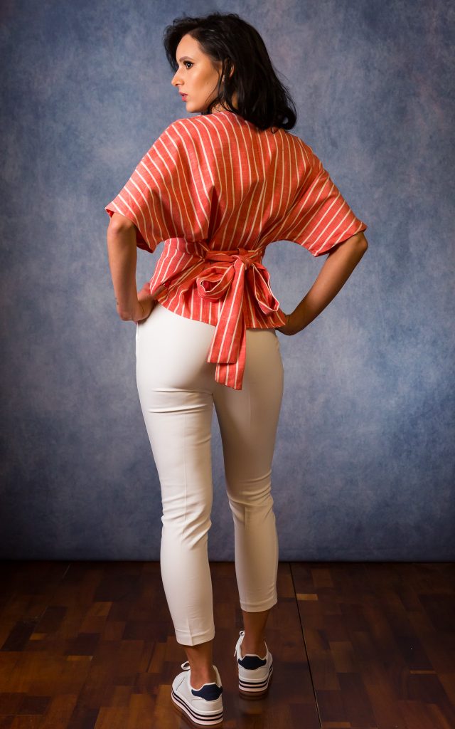 Bluza superba,fabricate din tesatura moale de bumbac,in tonuri calde de rosu cu dungi verticale albe. Croiala este potrivita pe corp,cu posibiitatea ajustarii dupa ppreferinta datorita cordonului lung din acelasi material ce se poate lega atat in fata cat si in spate. Accentueaza silueta si o pune in valoare si datorita decolteului in V cu inchidere in nasturi in fata. Prezinta maneci lejere ¾. Datorita designului original si modern va arata foarte bine in diverse combinatii si tinute stilate casual-chic pentru timpul liber si office pentru birou