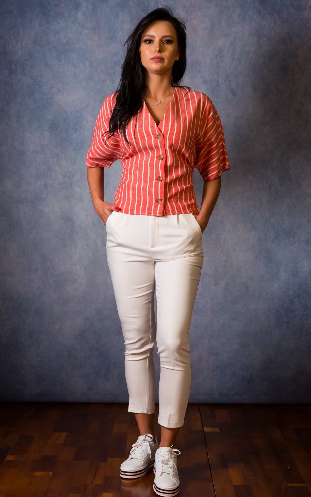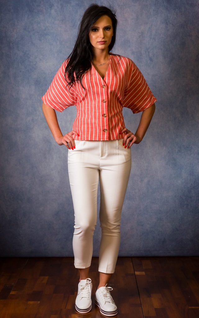 Bluza din bumbac, rosie cu dungi albe. Maneca treisferturi, cordon lung in talie care se poate lega atat la spate cat si in fata. O bluza versatila, dintr-un material de calitate deosebita. Ideala atat pentru tinute casual cat si office. Se incheie cu nasturi albi in fata, decolteu in V.