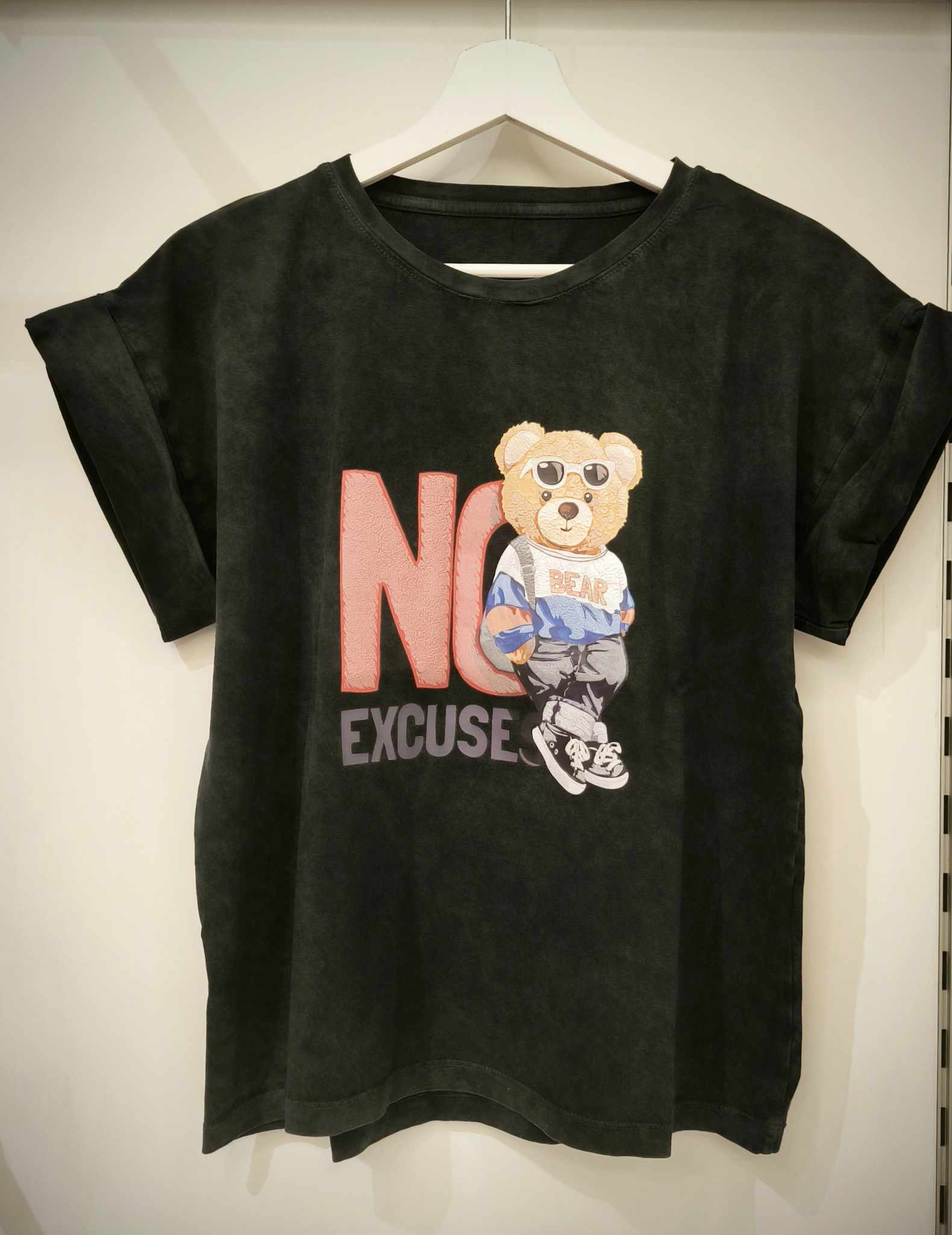 Adaugă un strop de căldură și personalitate garderobei tale cu un tricou negru din bumbac, decorat cu un imprimeu adorabil de ursuleț. Fabricat din bumbac 100% de calitate, acest tricou oferă un confort deosebit, fiind ideal pentru purtare zilnică. Designul cu ursuleț adaugă o notă jucăușă și drăgălașă, perfectă pentru un look casual și relaxat. Potrivit pentru orice sezon, acest tricou se asortează ușor cu jeansi, pantaloni scurți sau fuste, fiind o alegere excelentă pentru orice ocazie.