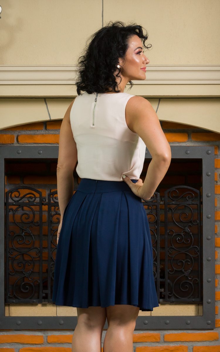 Fusta din vascoza Barocca,cu pliuri ,bleumarin .O fusta ce avantajeaza orice silueta ,potrivita pentru tinute de zi,office.