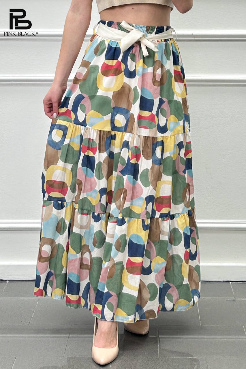 Fii în centrul atenției cu această fustă lungă de damă, cu un imprimeu geometric abstract în culori vesele: verde, roz, galben, albastru și maro.