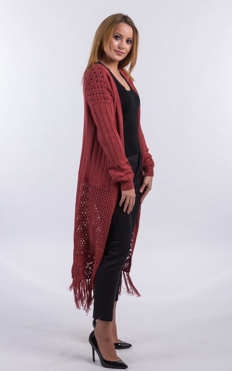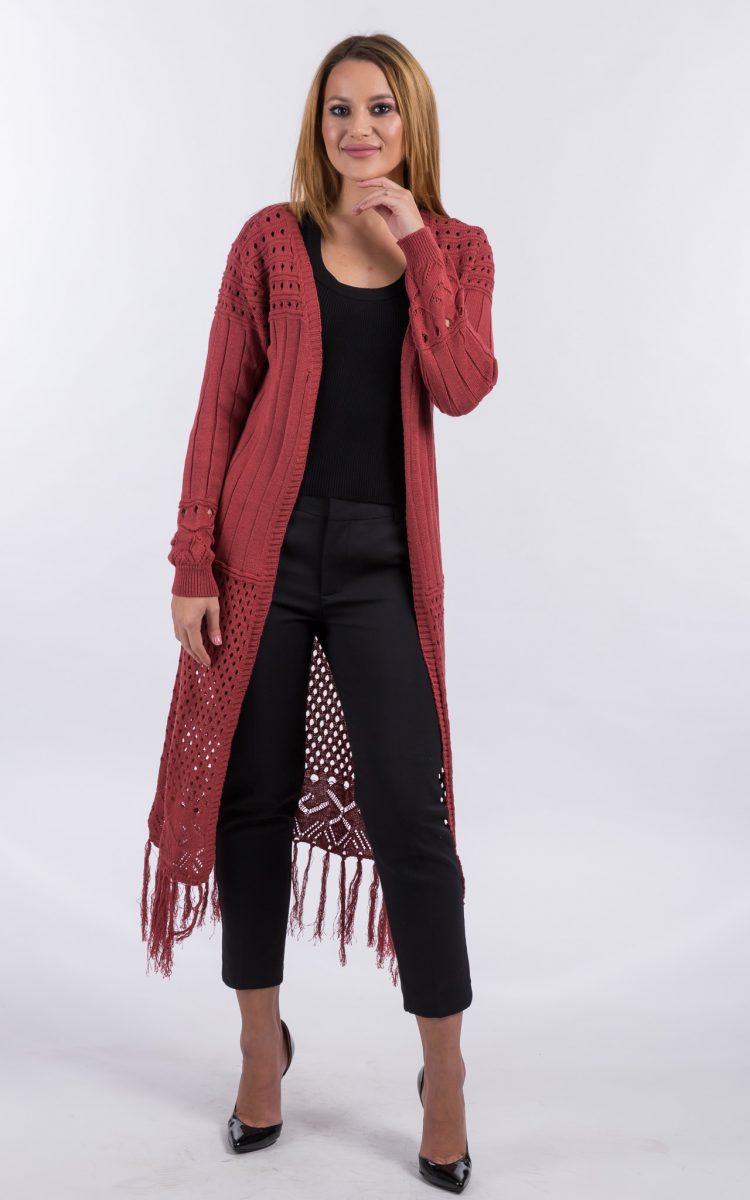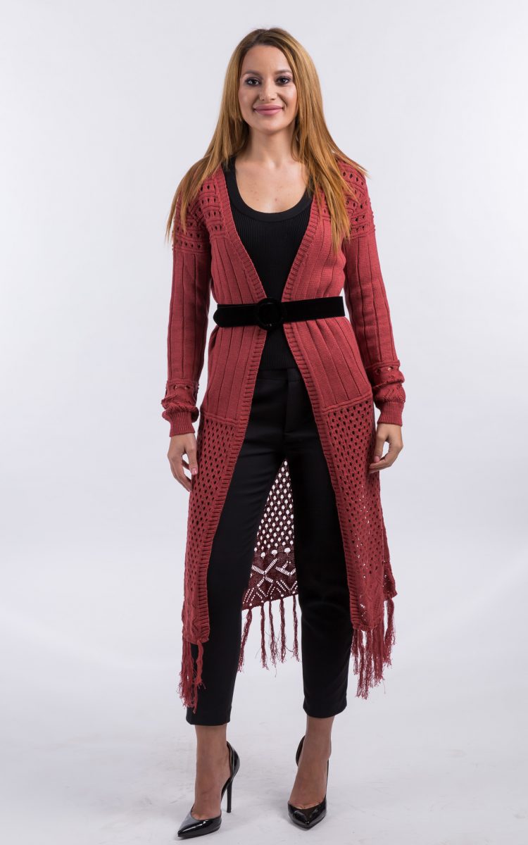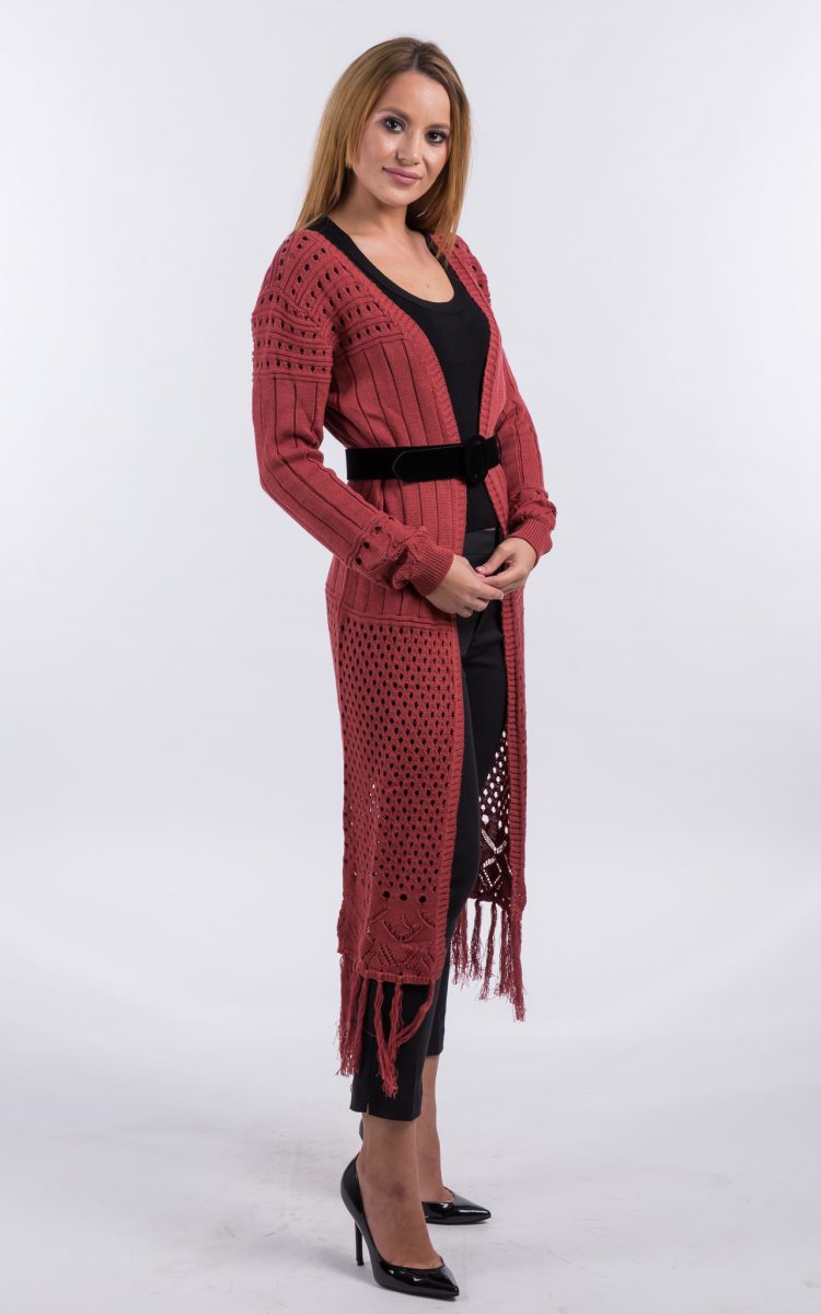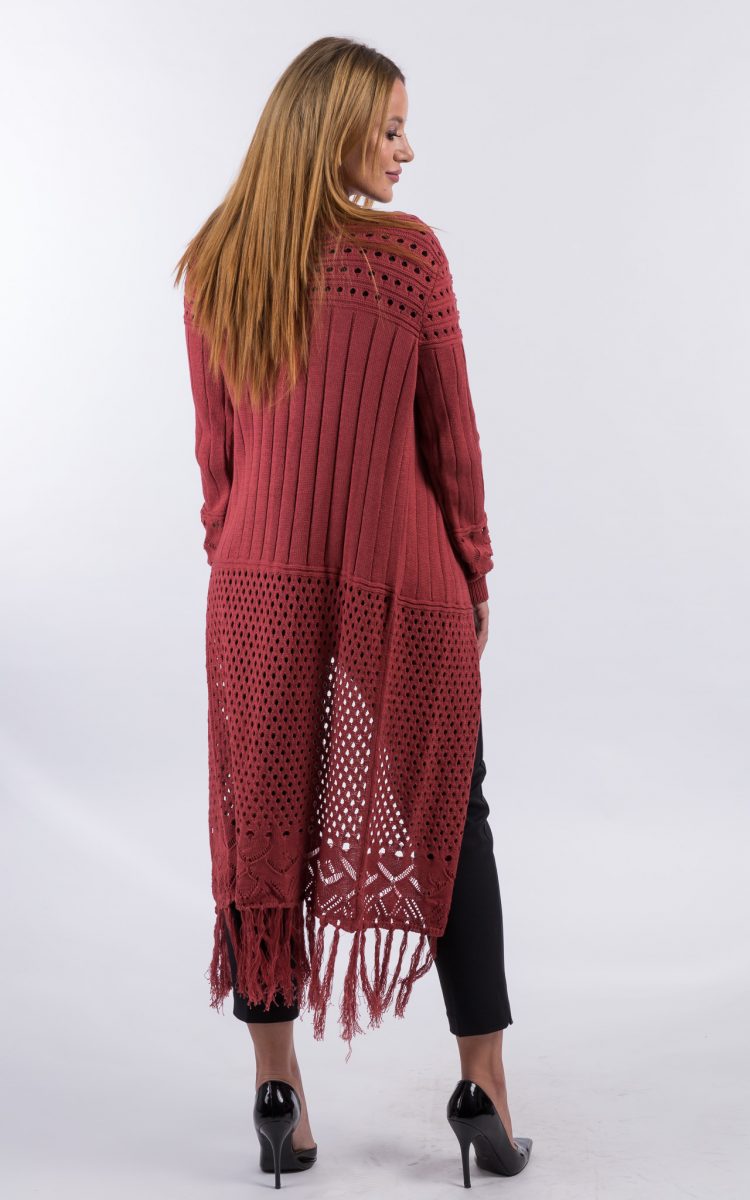 Cardigan tricotat, one size, grena. Un cardigan interesant, tricotat fin, cu maneca lunga si lungime pana la jumatatea gambei. Completeaza elegant o tinuta cu pantalon, fie sport sau office.
