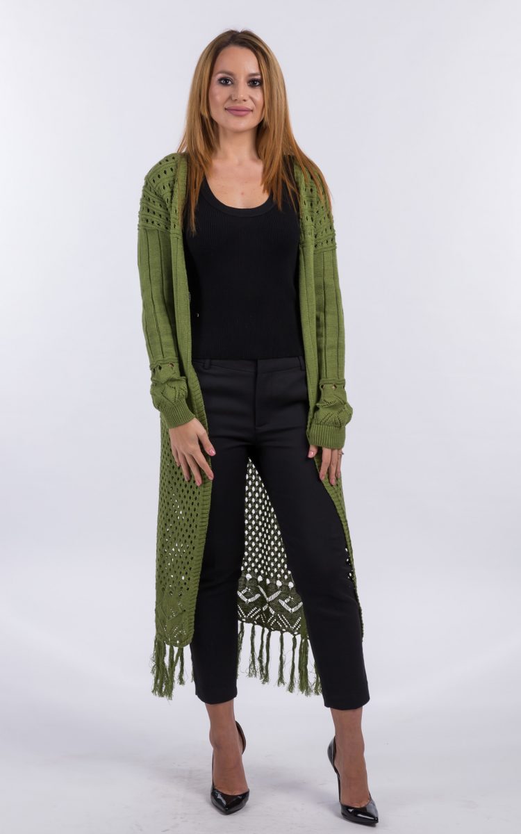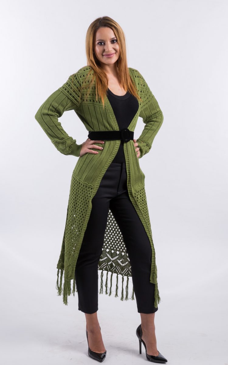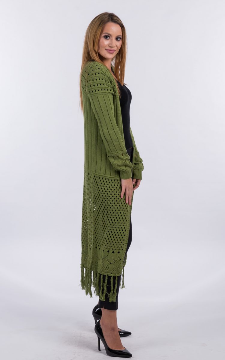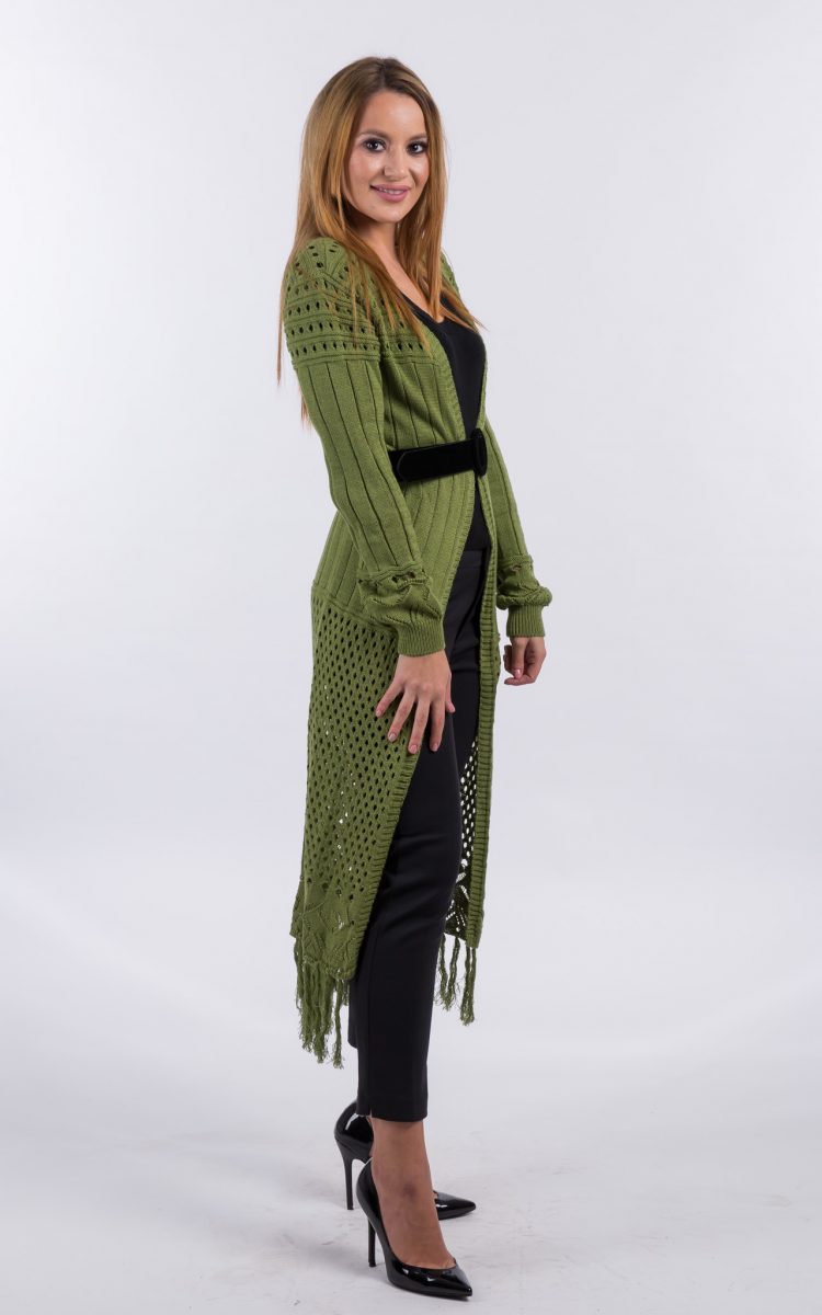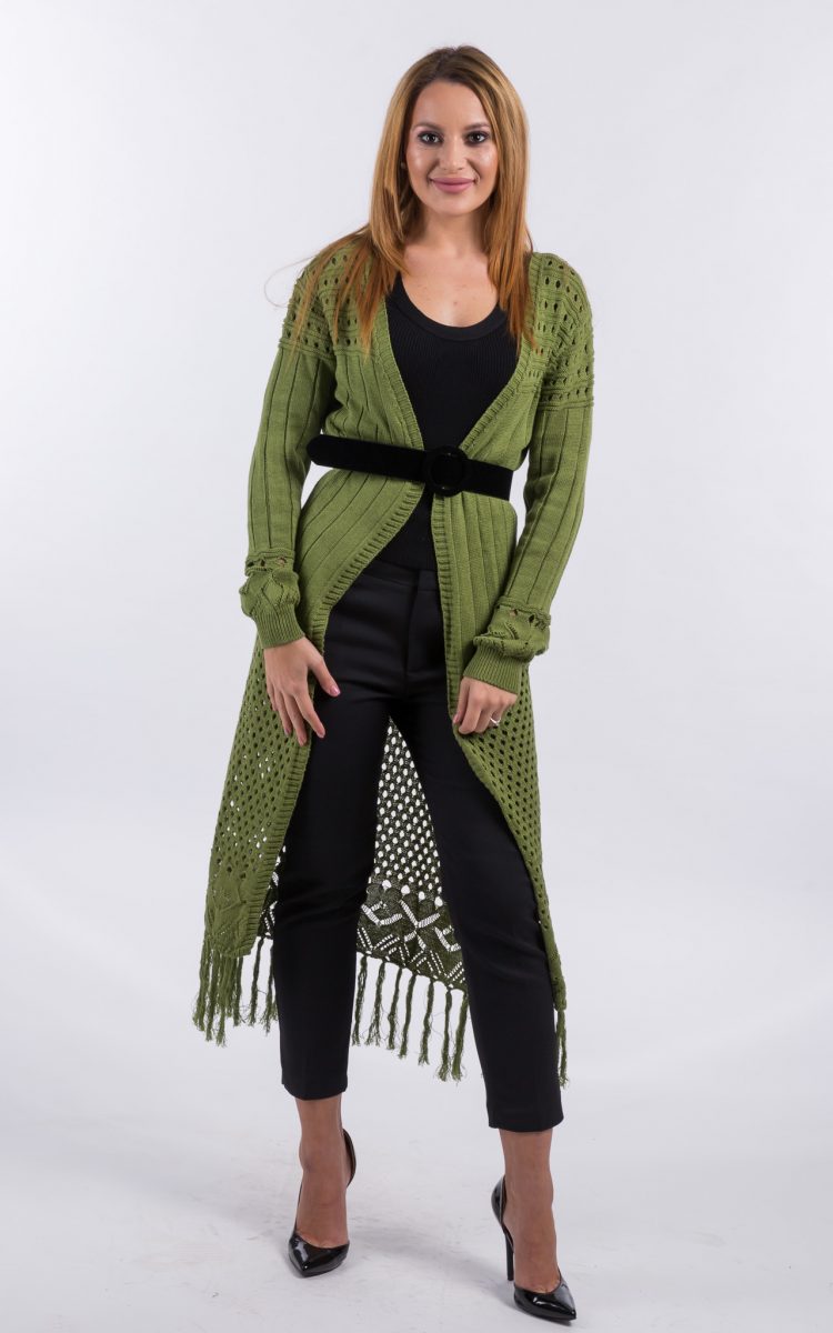Cardigan tricotat, one size, verde. Un cardigan interesant, tricotat fin, cu maneca lunga si lungime pana la jumatatea gambei. Completeaza elegant o tinuta cu pantalon, fie sport sau office.