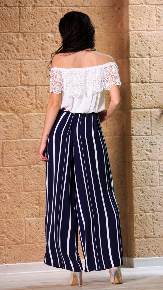 Pantaloni lejeri din material vaporos de calitate. Talie inalta marcata de cureaua de culoare rosie. Croi amplu, imprimeu cu dungi verticale albe si bleumarin. O croiala extrem de feminina care subliniaza talia. Pantalonul are elastic in partea din spate si nu este prevazut cu nasture sau fermoar.
