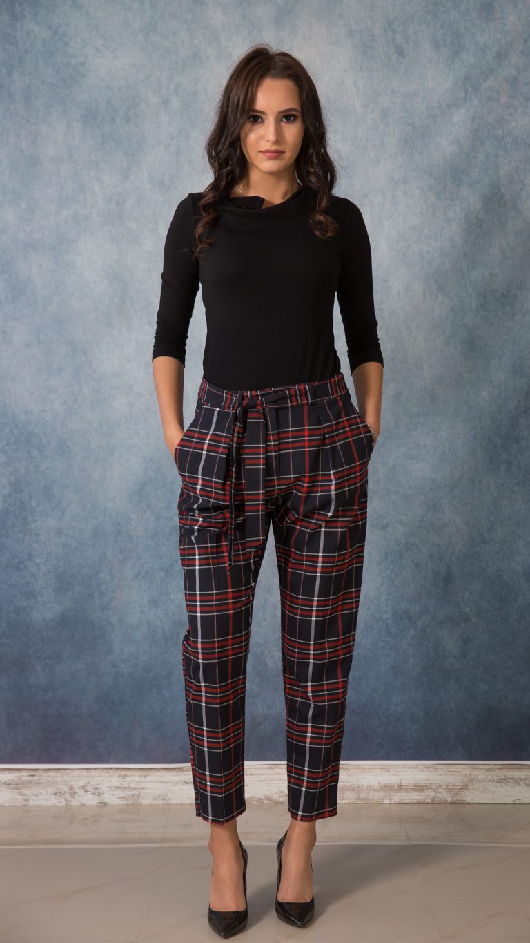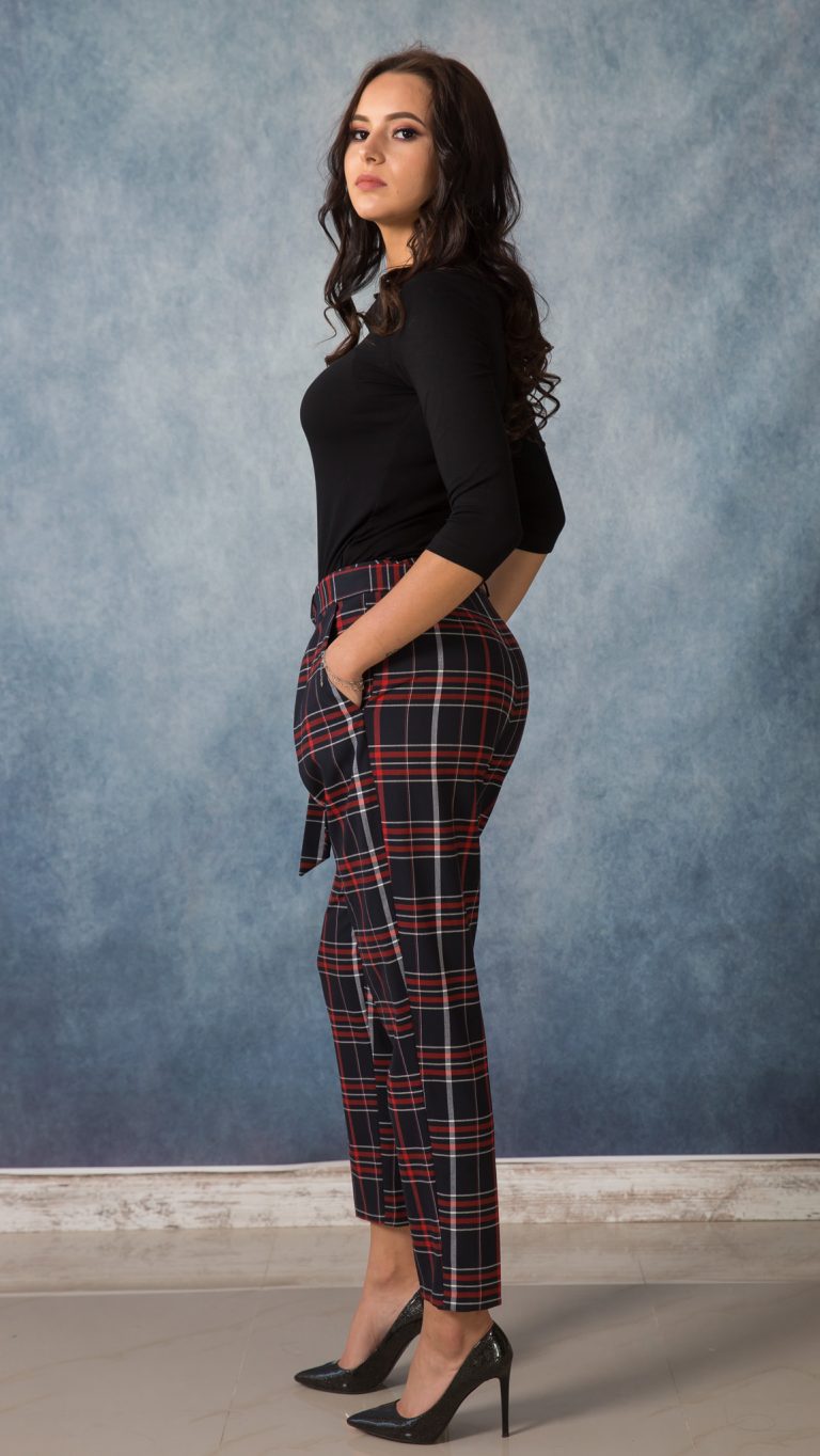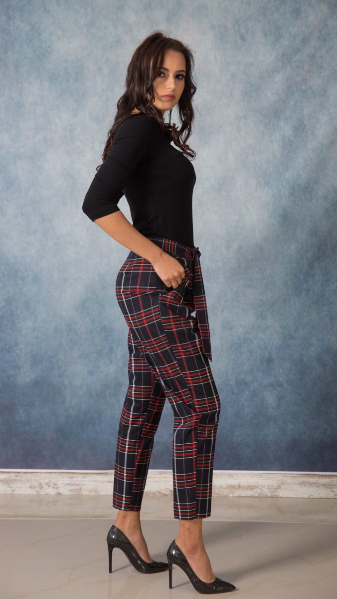 Pantaloni cadrilati din bumbac, cu talie inalta, lungime deasupra gleznei, accesorizati cu curea asortata. Inchidere frontala cu fermoar si nasture.