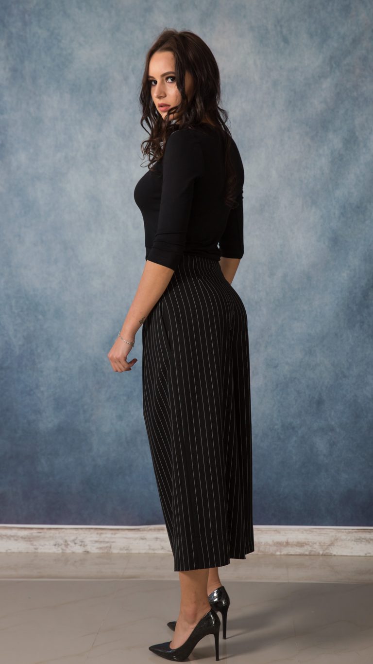 Fusta pantalon la Donna, din stofa gri inchis cu dungi subtiri, albe. O fusta pantalon eleganta si versatila, o alegere inspirata pentru o tinuta office deosebita.