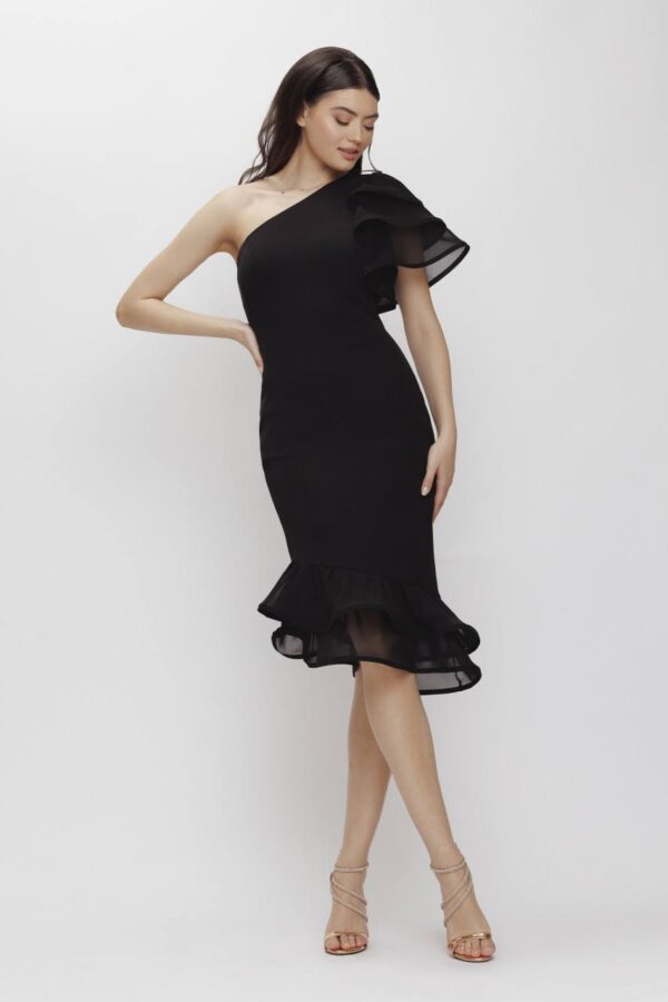 - Rochie neagra de ocazie din voal, cu un umar gol, croi cambrat asimetric. O rochie extrem de eleganta pentru ocaziile speciale din viata ta.