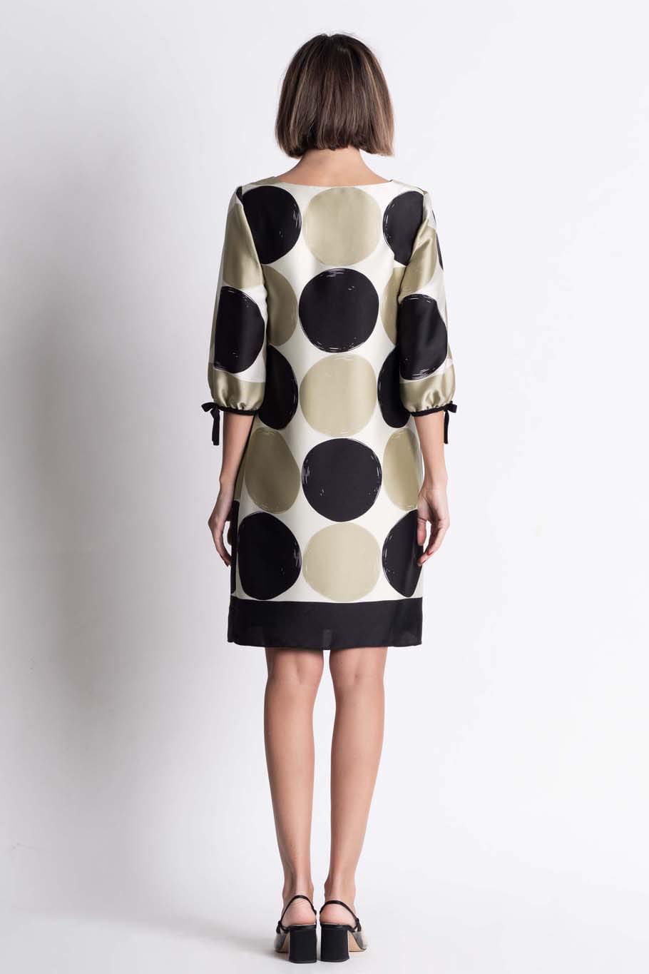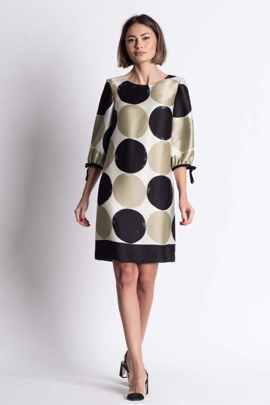 Rochie din saten cu print buline bej/negru si maneca 3/4. O rochie lejera, moderna si clasica in acelasi timp, in care orice femeie se va simti eleganta si atragatoare. Un design contemporan, conceput pentru a se potrivi cu toate formele, dimensiunile si ocaziile.O piesa usoara si versatila.