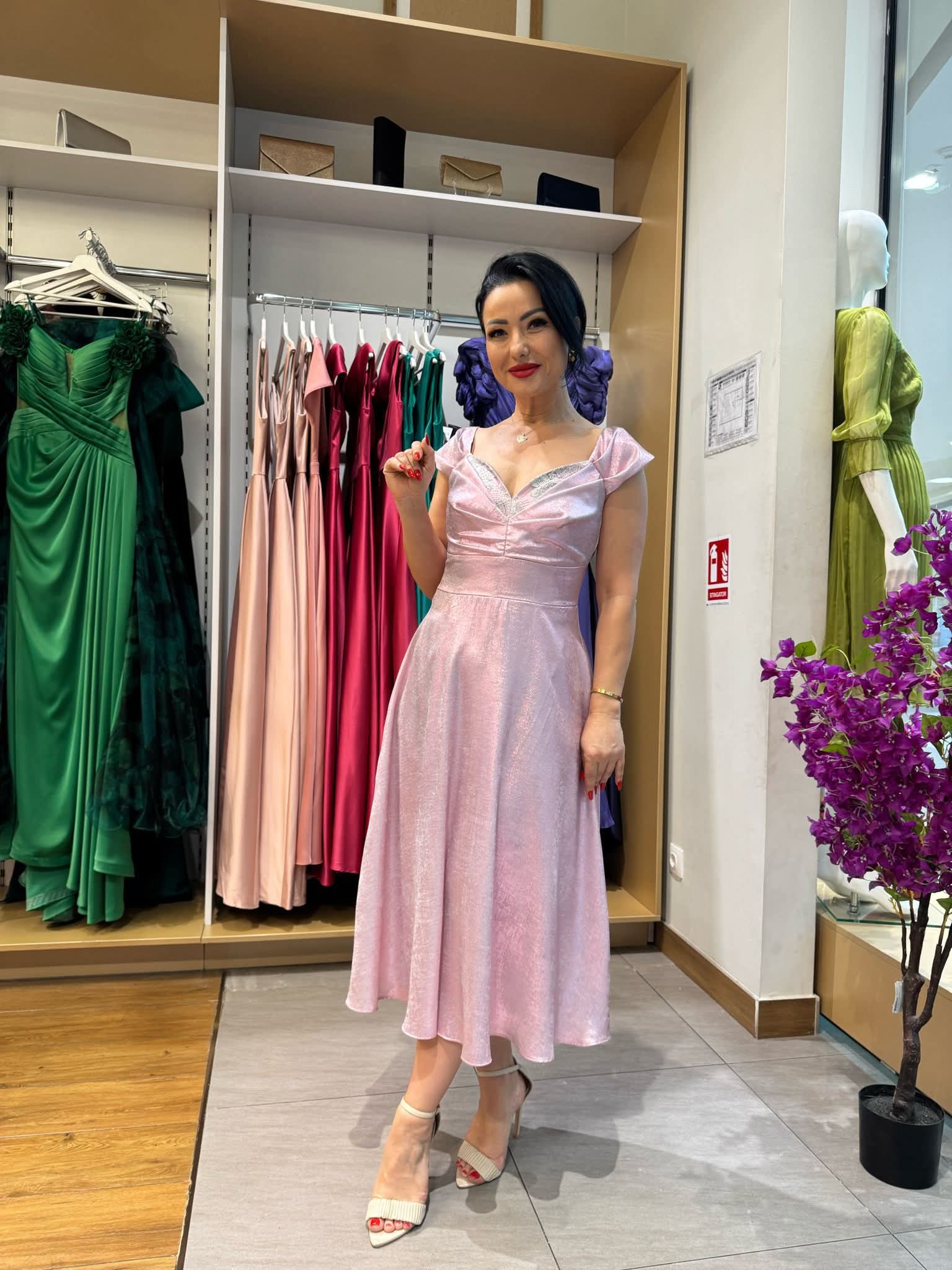 Rochie midi roz pudrat lucios, decolteu în inimă