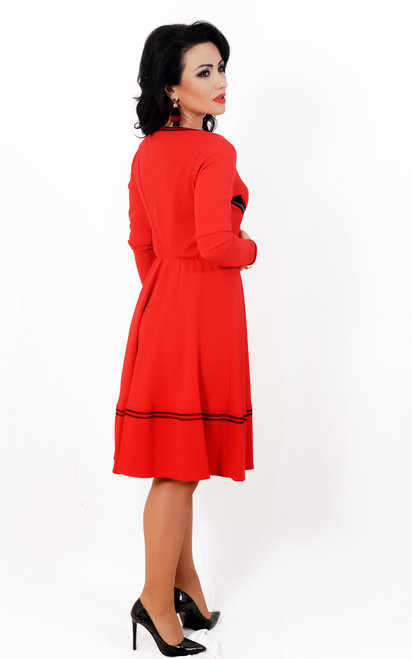 Rochie motive traditionale din jerse rosu cu aplicatii dantela si broderie. Lungime sub genunchi, fusta ampla, taietura in talie care marcheaza silueta.