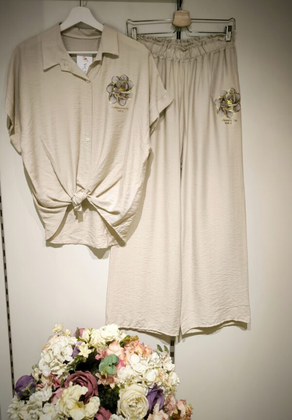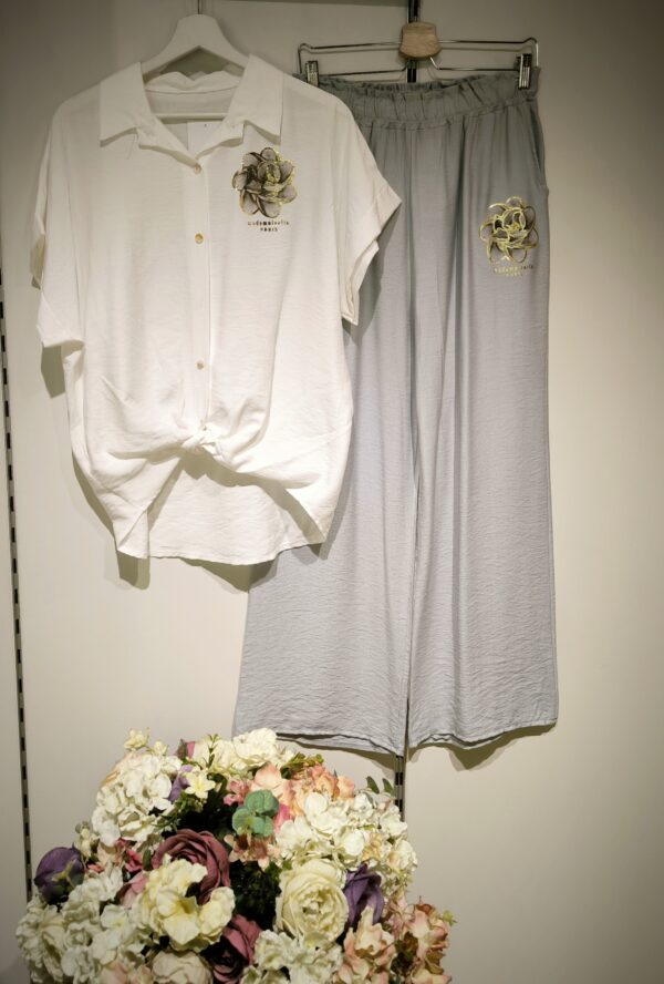 Acest complet elegant include o cămașă lejeră și pantaloni largi, confecționați dintr-un material ușor și respirabil, ideal pentru a te menține răcoros și relaxat în timpul verii.