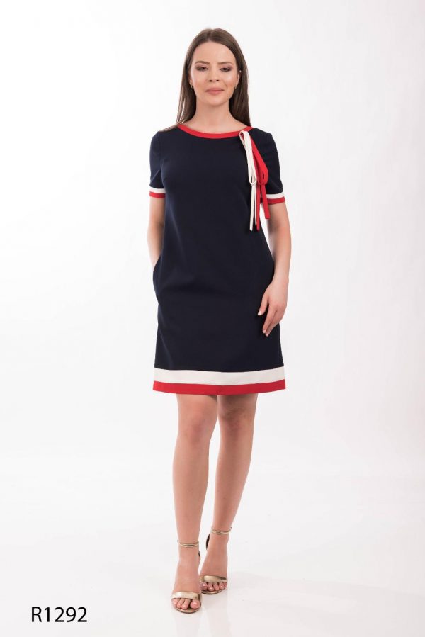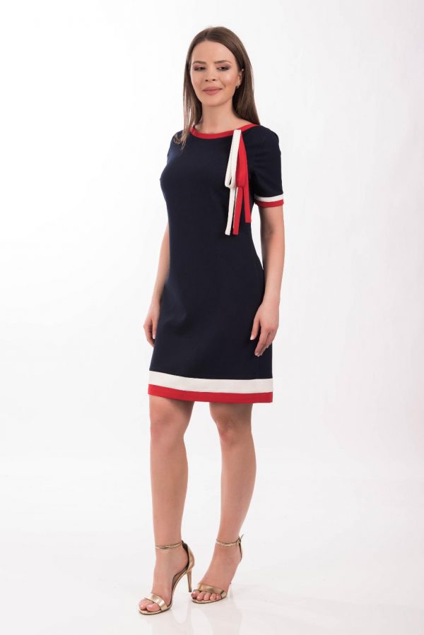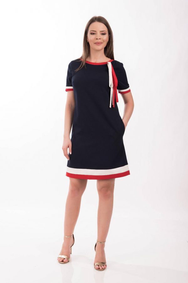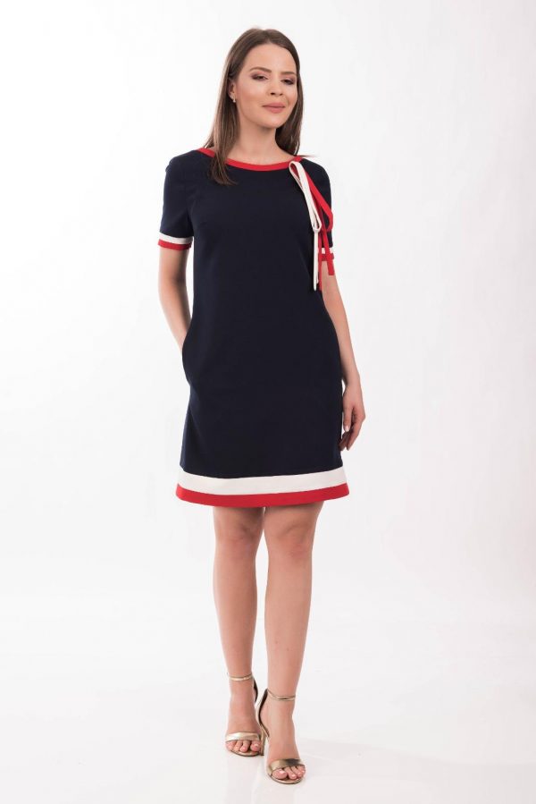 Rochie de zi culoare bleumarin, croi litera A. Cu accente de culoare alb rosu la maneci,terminatie si decolteu.Rochia simpla cu o croiala lejera in A este potrivita pentru orice silueta. O poti purta atat la serviciu cat si la o intalnire in oras.Prezinta buzunare functionale si detaliu tip funda in culorile alb- rosu pe piept.
