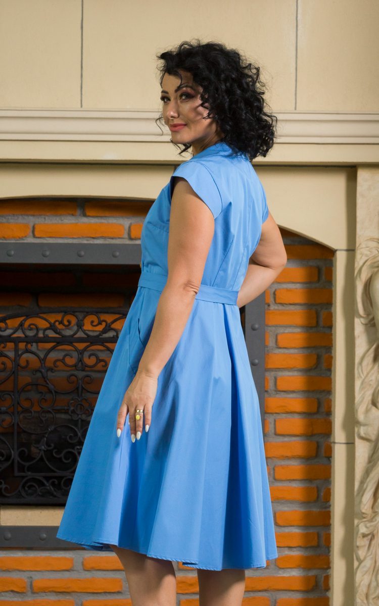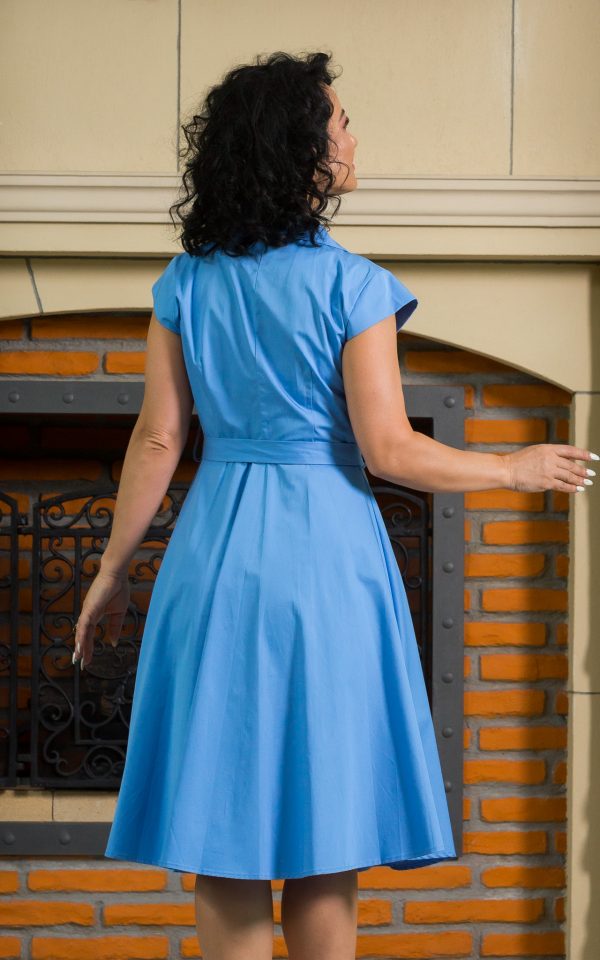 Rochie de zi Karol din bumbac, bleu. Rochia are doua randuri de nasturi si se incheie in fata cu cordon. Maneca scurta, lungime midi, croi cambrat, cu buzunare in laterale.