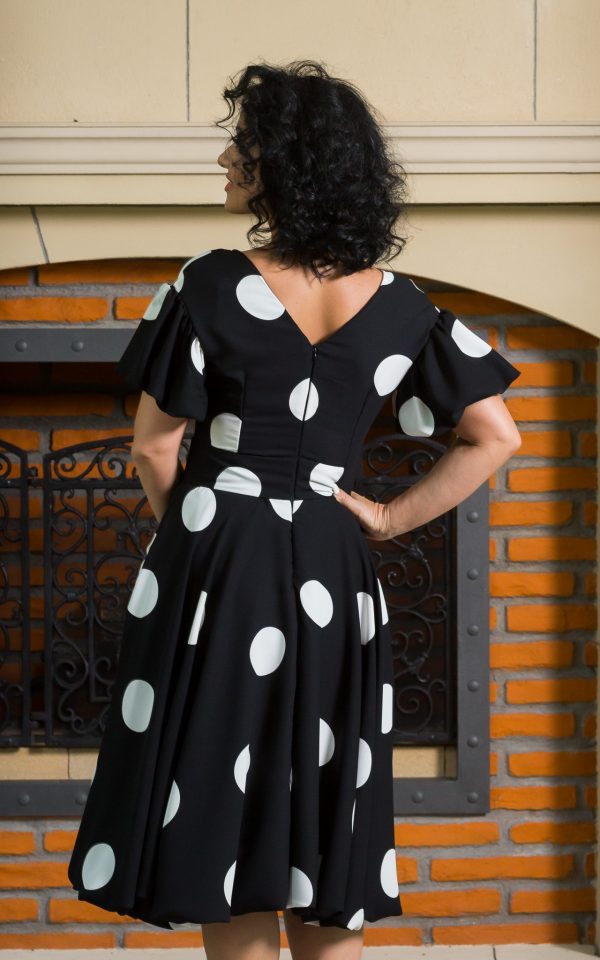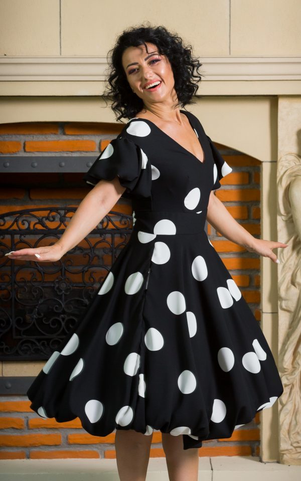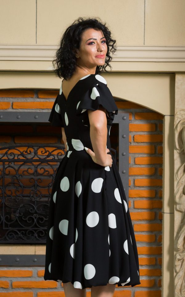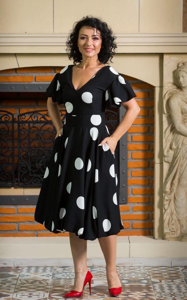 Rochie midi din bumbac, neagra. Rochie midi din bumbac , fond negru cu buline albe, cu maneci bufante si decolteu in V.O rochie extrem de feminina,moderna, ce pune talia in evidenta si ofera si libertate de miscare.Prezinta buzunare laterale, inchidere cu fermoar pe spate.