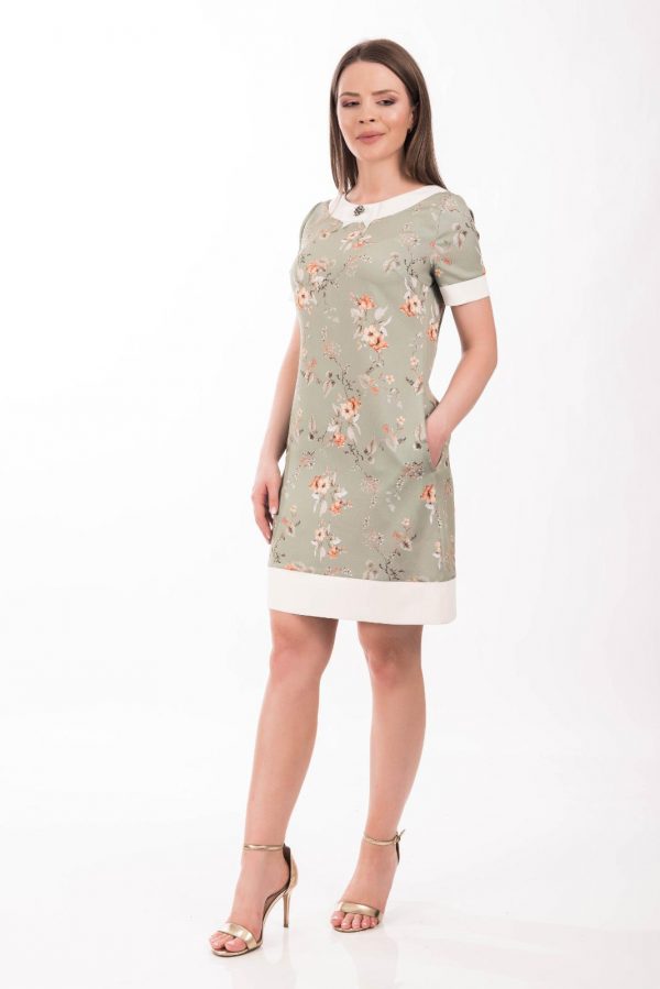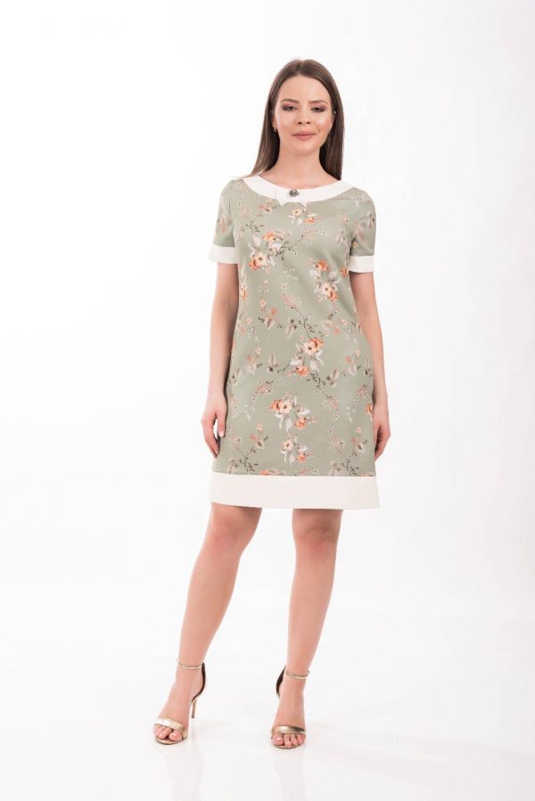 Rochie office imprimeu floral discret.Are croiala litera A,decolteu rotund la gat ,maneci scurte si un accesoriu tip fundita la gat.Moderna si confortabila,poate fi purtata atat la birou cat si la plimbari.