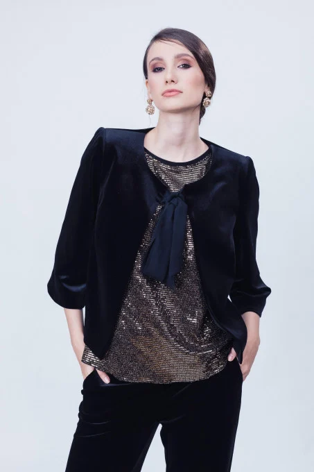 Modelul poartă măsura 38, dimensiuni model: 180 cm înălțime, 86 cm bust, 60 cm talie, 88 cm șold