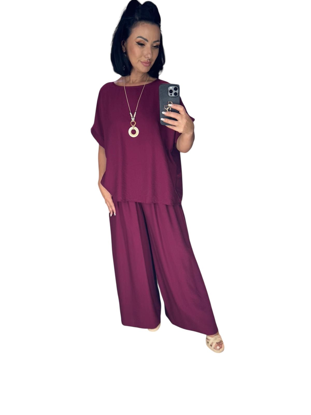 Compleul perfect pentru femeia modernă care apreciază confortul fără a renunța la stil! Acest set este compus dintr-o bluză cu croială lejeră și pantaloni largi, ambele piese realizate dintr-un material fluid, ușor de purtat.